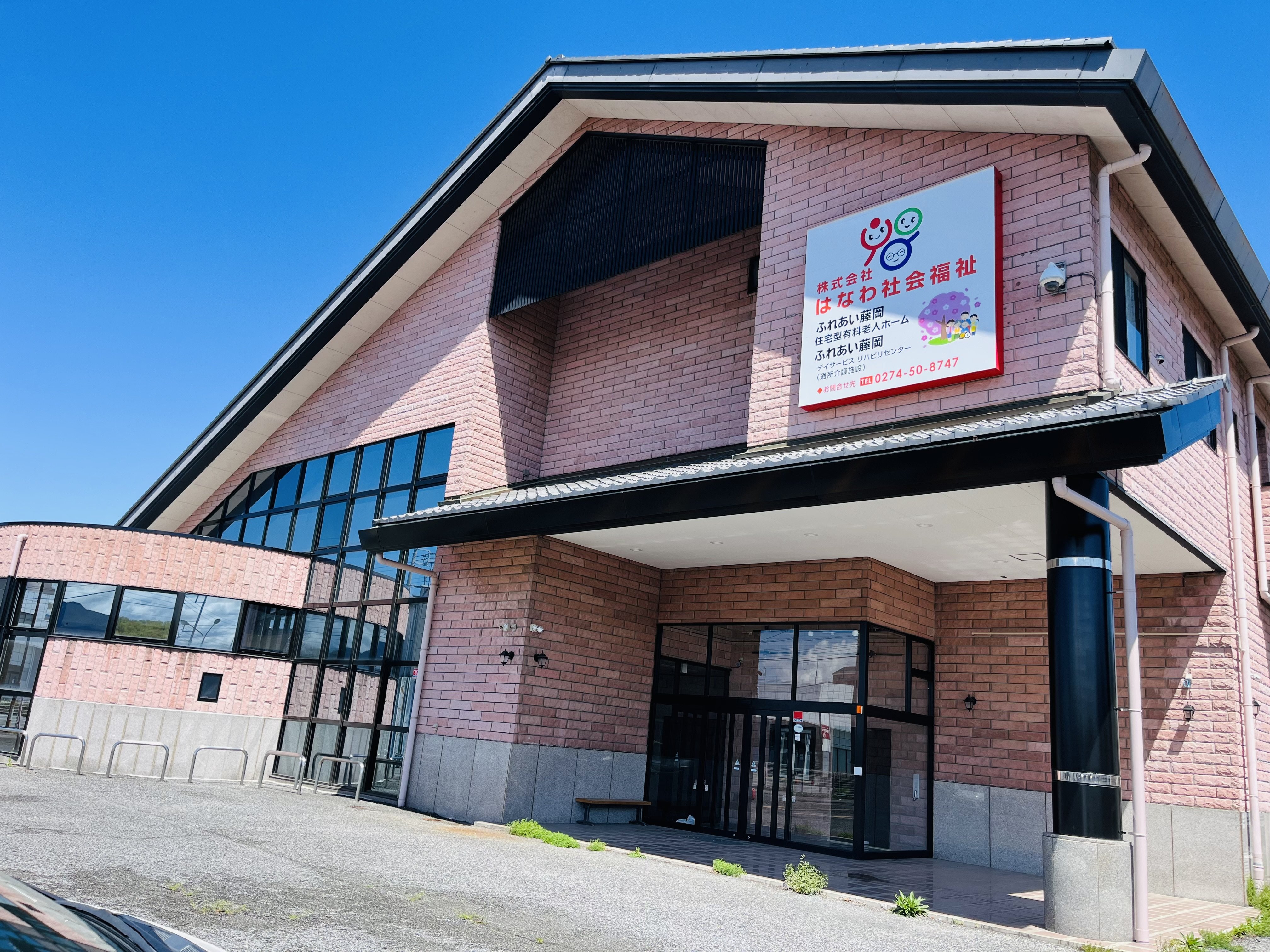 施設の外観は暖かな雰囲気のレンガの外壁と開放的な大きなガラス窓が特徴的です。